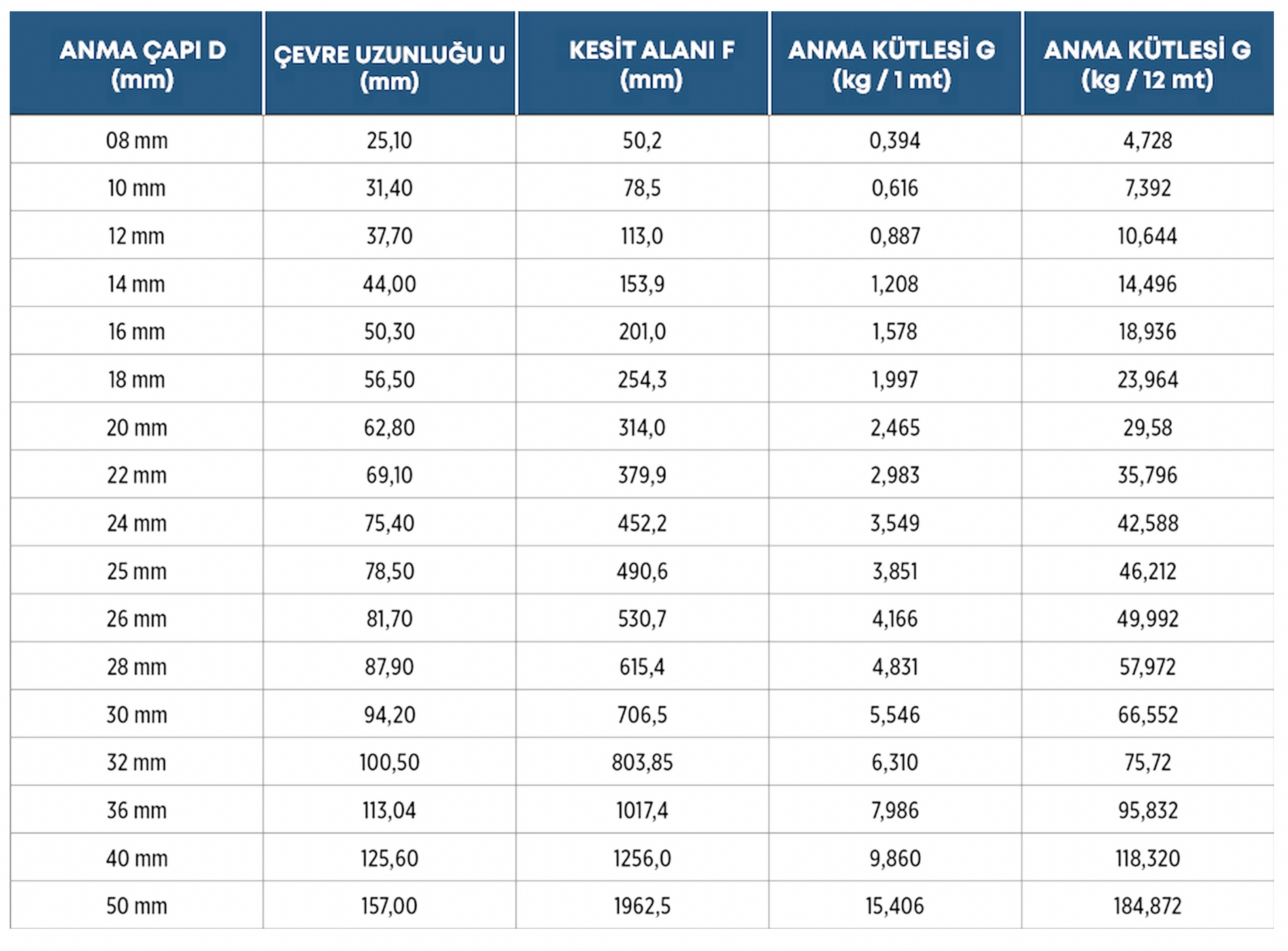 NERVÜRLÜ İNŞAAT DEMİRİ AĞIRLIK TABLOSU