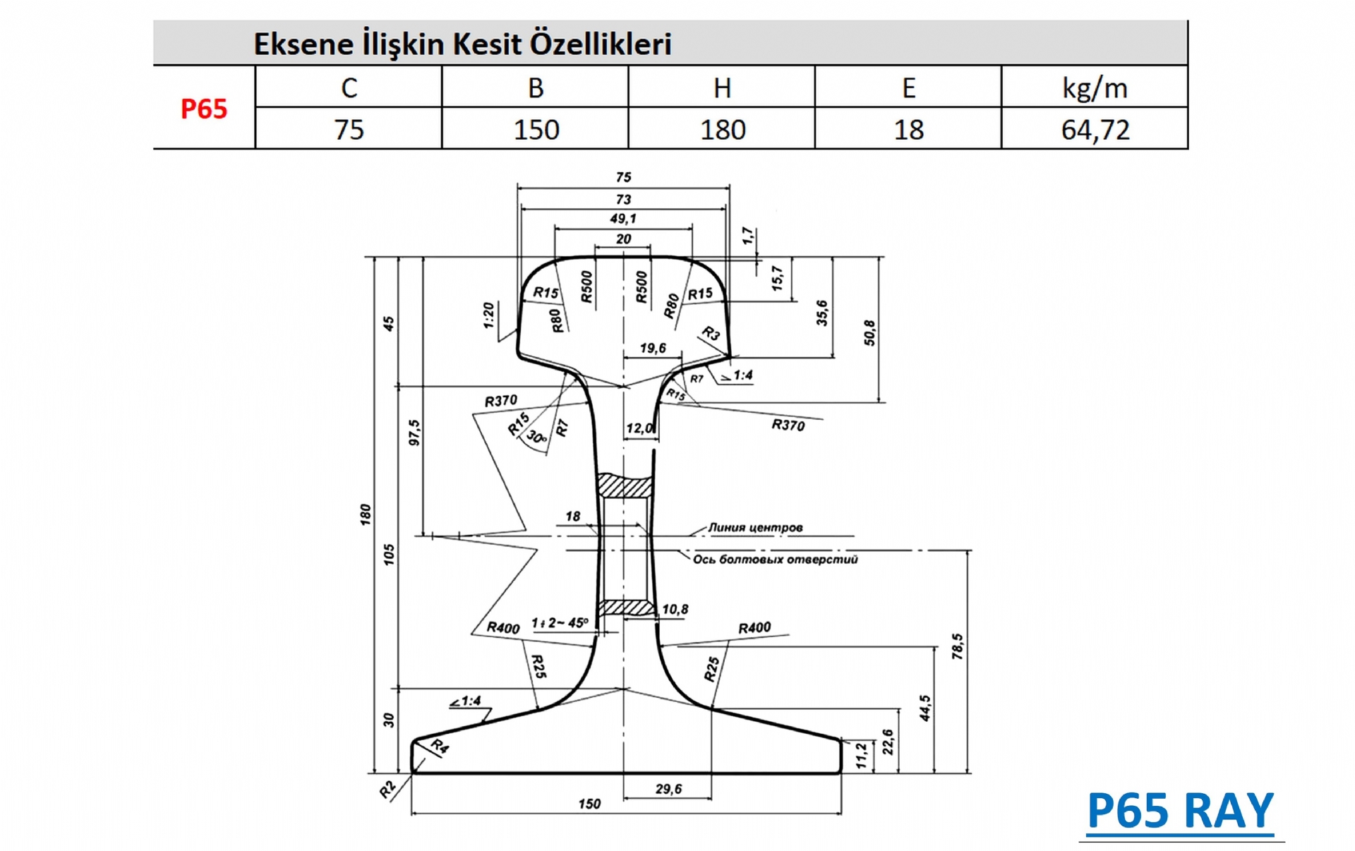 Mekanik Özellikler: R65/P65 rayları, yaklaşık 65 kg metre başına kütle ile Gost 8161 - 75 standardı ile uyumludur. Kimyasal bileşime, yüksek karbon içeriği (%0.71 -%0.82) ve orta manganez içeriği (%0.75 -%1.05) hakimdir: gerilme mukavemeti 880 MPa'yı aşar,%690 MPa'yı aşar, verim gücü%8'dir. Bu, R65/P65 raylarının deformasyon ve aşınmaya karşı güçlü bir dirence sahip olmasını sağlar ve uzun vadeli yüksek frekans ve ağır yük yuvarlamasına dayanabilir.